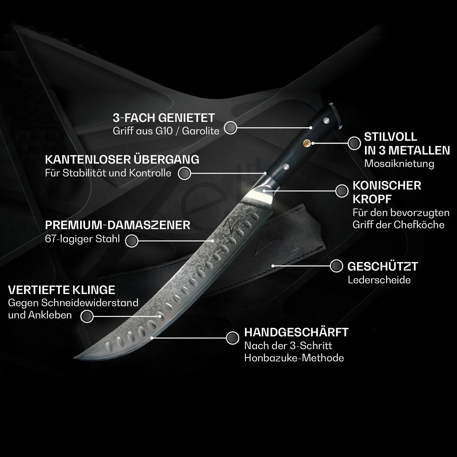 Das Zelite Infinity by Klarstein Alpha-Royal Japanese 10″ Fleischermesser überzeugt durch Präzisionsschnitte, denn es verfügt über eine 9 – 12° Kantenschärfe mit einem spiegelpolierten Schneidewinkel. Dank der einmaligen Schärfe und der Einkerbungen in der Klinge wird es dir besonders leicht fallen, auch große Stücke Wildfleisch sauber zu zerlegen. Dank minimalem Schnittwiderstand gleitet das professionelle Metzgermesser fast wie von selbst durch Rind, Schwein, Geflügel oder Fisch und durchtrennt diese mit Leichtigkeit und präzisen Schnitten.
