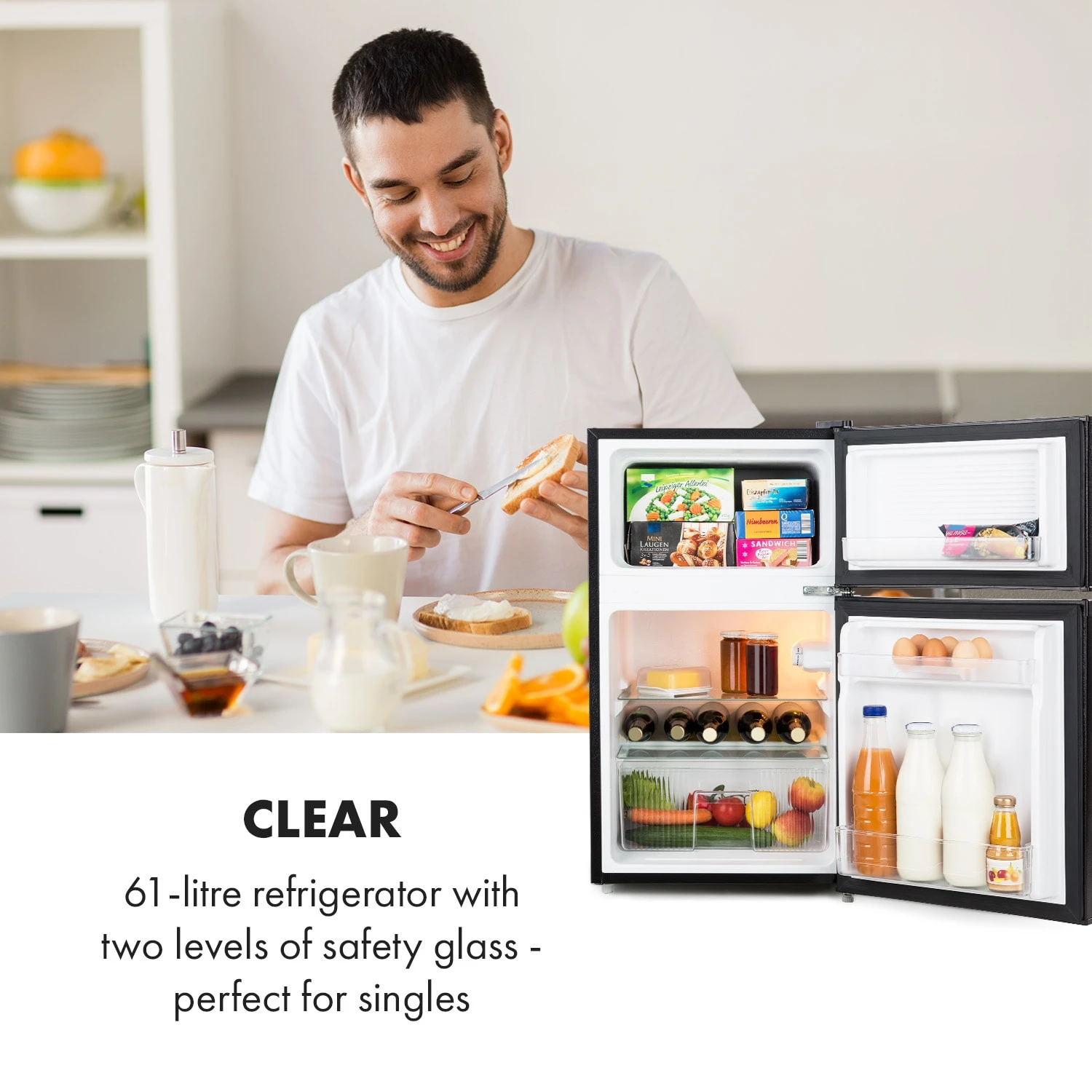 Bestückt mit zwei herausnehmbaren Glas-Einschüben und einem 61 Liter Kühlschrank bietet er genug Platz für alle frischebedürftigen Lebensmittel eines Ein- bis Zweipersonenhaushalts. Flaschen, Dosen und Snacks finden in zwei separaten Türdepots einen geeigneten Aufbewahrungsort, während frisches Gemüse im herausnehmbaren Crisperfach eingelagert wird. Das hält Gurken und Salat bei nahezu 0 °C wesentlich länger frisch und knackig. Tiefkühlgut hingegen findet seinen idealen Platz im 26-Liter-Gefrierfach, welches du separat öffnen und schließen kannst.
