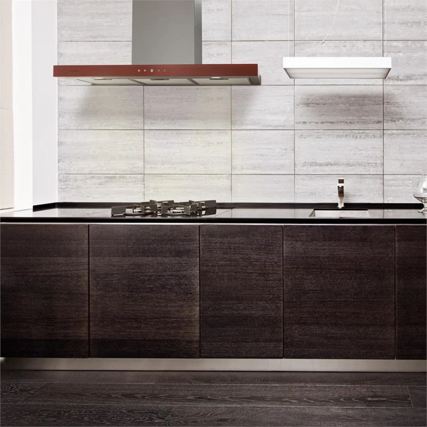 Das elegante Produktdesign setzt sich ernsthaft mit dem innenarchitektonischen Ansatz amerikanischer Küchen und zeitgenössischen Design-Vorstellungen auseinander. Die Vorderseite der Dunstabzugshaube ziert eine Frontblende aus rotem Sicherheitsglas, außerdem verfügt sie über eine blau beleuchtete Armatur mit berührungsempfindlicher Touch-Bediensektion. Auf beiden Seiten finden sich zudem LED-Strahler, die einen optimalen Einblick auf das Kochgeschehen geben.