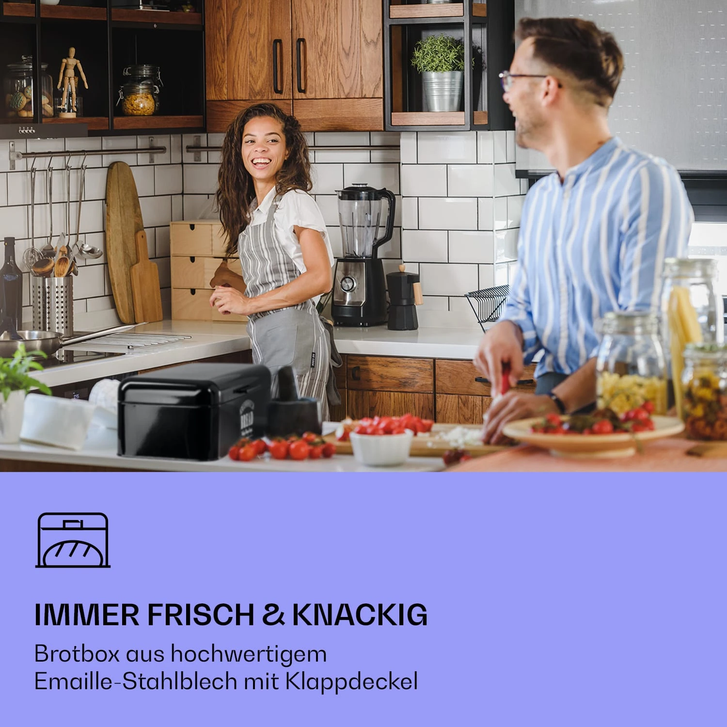 Praktisch und schick! Die große Delaware Brotbox im 40er-Jahre-Look von Klarstein ist nicht nur sehr stabil und groß genug für die gleichzeitige Lagerung von mehreren Broten und Backwaren, sondern auch ein absoluter Hingucker in der Küche. Dank der Lüftungslöcher auf der hinteren Seite des Brotbehälters ist für die wichtige Luftzirkulation gesorgt. Feuchtigkeit und Schimmelbildung werden somit in dem Gehäuse aus hochwertigem Emaille-Stahlblech mit Klappdeckel konsequent verhindert! Die Aufbewahrungsbox lässt sich schnell und einfach mit einem feuchten Tuch reinigen.