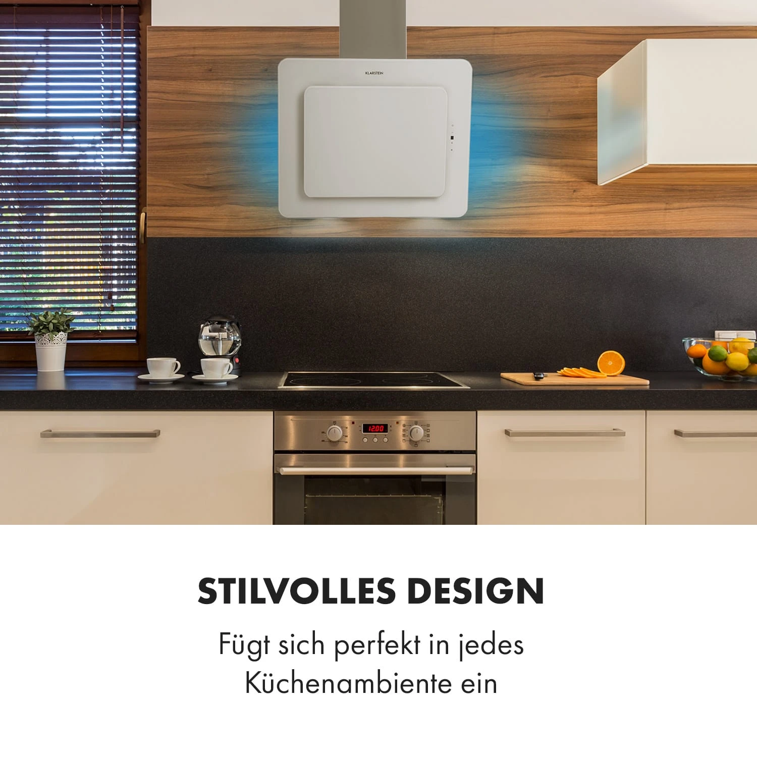 Mit drei Leistungsstufen kann die Arbeitsleistung der Helena 60 Dunstabzugshaube unkompliziert an das Kochgeschehen angepasst werden. Auf der höchsten Stufe befördert sie bis zu 595 m³/h Abluft aus der Küche und wird auch mit der Zubereitung mehrerer Gänge fertig. Dank modernster Technik halten sich dabei Geräuschaufkommen und Energieverbrauch im angenehm niedrigen Bereich mit gerade einmal 63 dB und Energieeffizienzklasse A. Besonderen Reiz erlangt die Klarstein Helena 60 Dunstabzugshaube nicht nur durch ihr edles Äußeres, sondern auch durch ihre optional zuschaltbare Ambiente-Beleuchtung mit neun unterschiedlichen Farben. So verleiht die kopffreie Wandabzugshaube jeder Küchenzeile ihre eigene Stimmung. Zwei zuschaltbare LED-Kochflächenlampen ermöglichen jederzeit den ungetrübten Blick in Pfannen und Töpfe. Sämtliche Bedienelemente sind als Touchpanel mit Display direkt in die Oberfläche integriert. Alles nötige Material zur Wandmontage, ein Abluftschlauch sowie die passende Kaminverblendung sind im Lieferumfang enthalten. Mit Hilfe zweier Aktivkohlefilter kann die Haube auch vollkommen unkompliziert auf Umluftbetrieb umgerüstet werden.
