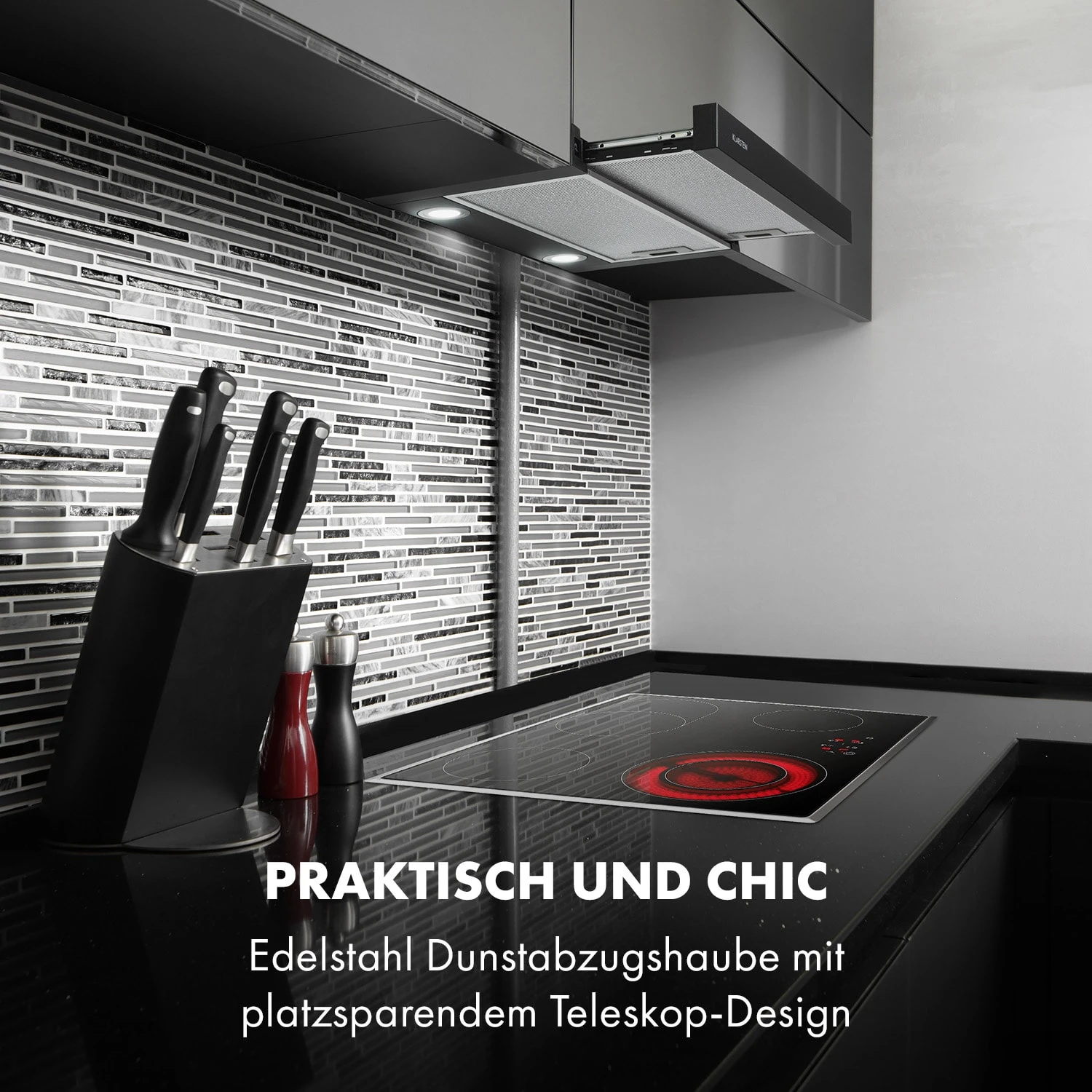 Besonderen Reiz erlangt die Klarstein Viola Dunstabzugshaube durch ihre Teleskop-Funktion: Einfach die Haube zum Einsatz ausziehen und nach dem Betrieb wieder unsichtbar in ihr Unterbau-Versteck zurückschieben. Die zwei Anbringungsmöglichkeiten lassen dich flexible entscheiden, wo du deinen neuen Küchen-Helfer befestigen willst: Sie kann einfach an der Wand über dem Kochfeld montiert oder unter deinem Hängeschrank angebracht werden. Mit den zwei Kipp-Schaltern lassen sich Licht und Luft-Abzug super einfach steuern. Die schicke Edelstahl-Verkleidung ist langlebig und leicht zu Reinigen. Der eingebaute Fett-Filter lässt sich leicht ausbauen und ist einfach mit Wasser und etwas Spülmittel zu reinigen.