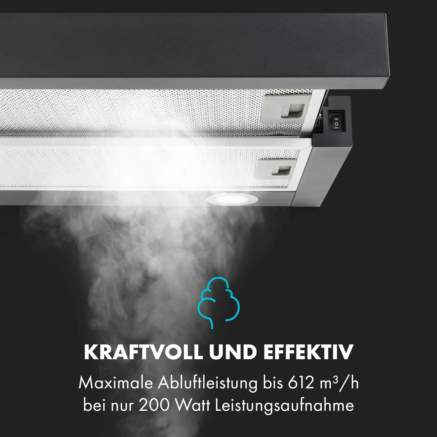 Mit zwei Leistungsstufen kann ihre Arbeitsleistung unkompliziert an das Kochgeschehen angepasst werden. Auf höchster Leistungsstufe befördert sie bis zu 612 m³/h Abluft aus deiner Küche. Zwei zuschaltbare LED-Kochflächenlampen ermöglichen jederzeit den ungetrübten Blick in deine Pfannen und Töpfe.